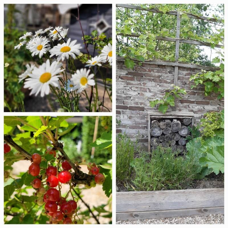 Zoals verse kruiden, wilde rucola, eetbare bloemen, snoep tomaatjes, zonnebloempitten. Heerlijk voor in een salade! Maar ook rode en blauwe bessen, kruisbessen, aardbeien, frambozen, bramen, druiven, kersen … zoveel lekkers, wat een weelde! …. heerlijk in een jam, sap of op een taart, …of gewoon zo uit de hand. Mmmm!